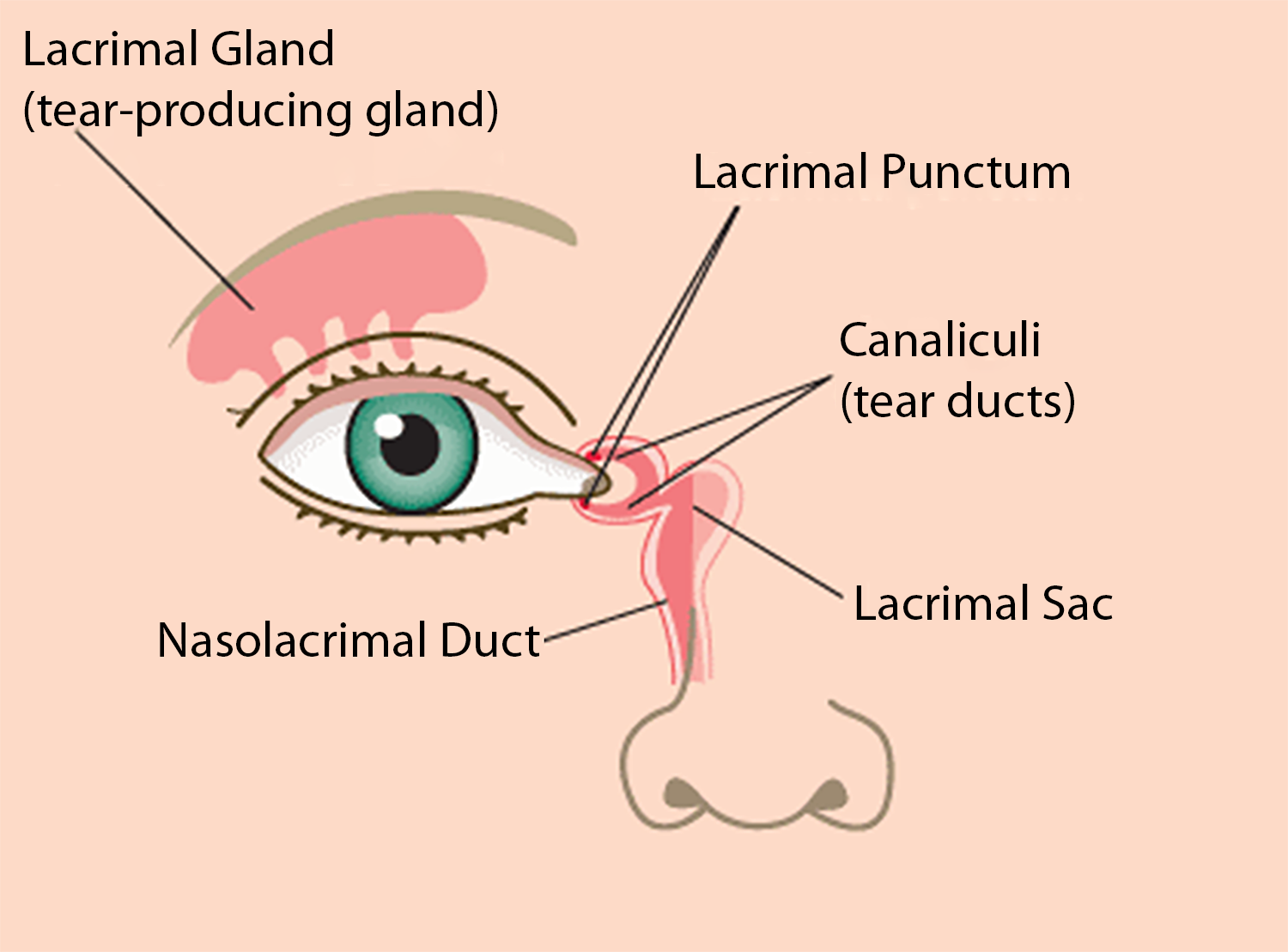 Excessive tears move down the lacrimal sac to the nasolacrimal duct and drain into the back of the nose.