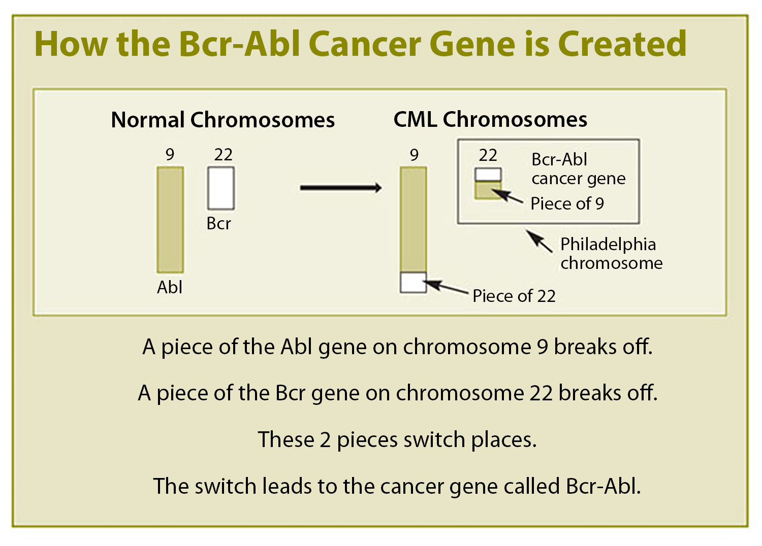 The Bcr and Abl genes combine to make the CML-causing gene called the Bcr-Abl cancer gene