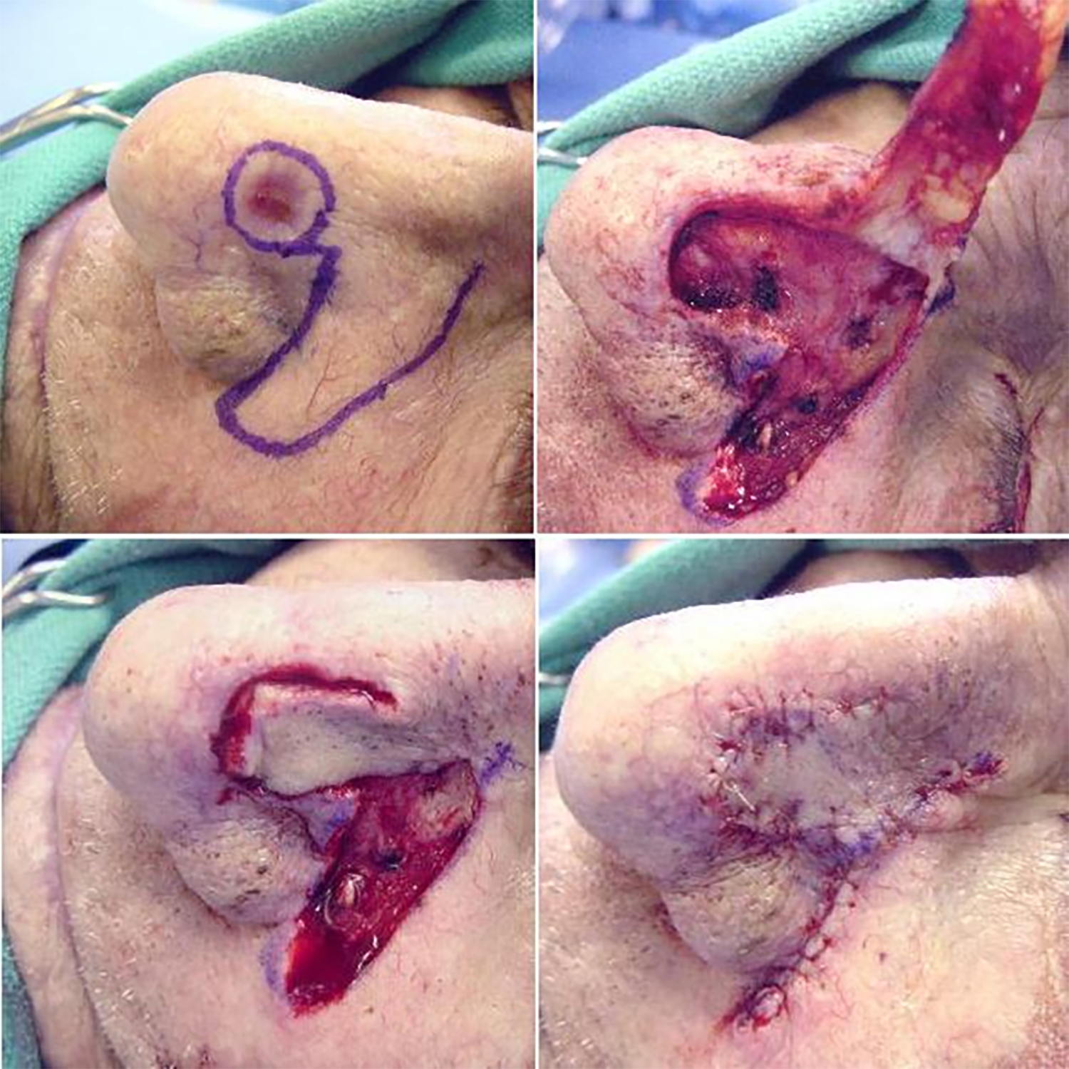Basal cell carcinoma of the nose is excised and repaired with a nasolabial rotation skin flap – see picture for an explanation of the procedure