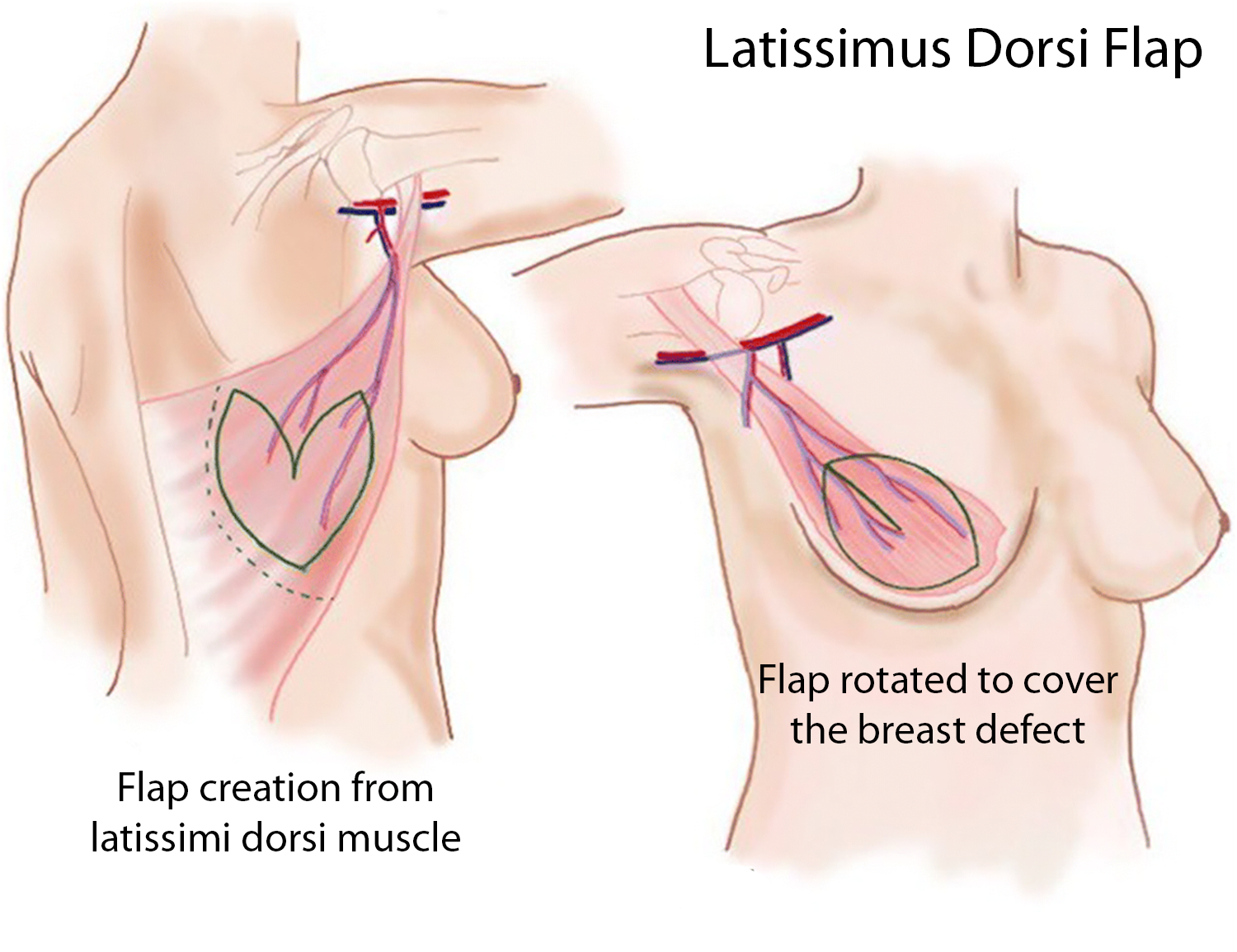 Autologous breast reconstruction - latissimus dorsi myocutaneous flap is muscle from the back with skin rotated to the anterior chest for the creation of breasts and often involves the use of a breast implant to create volume