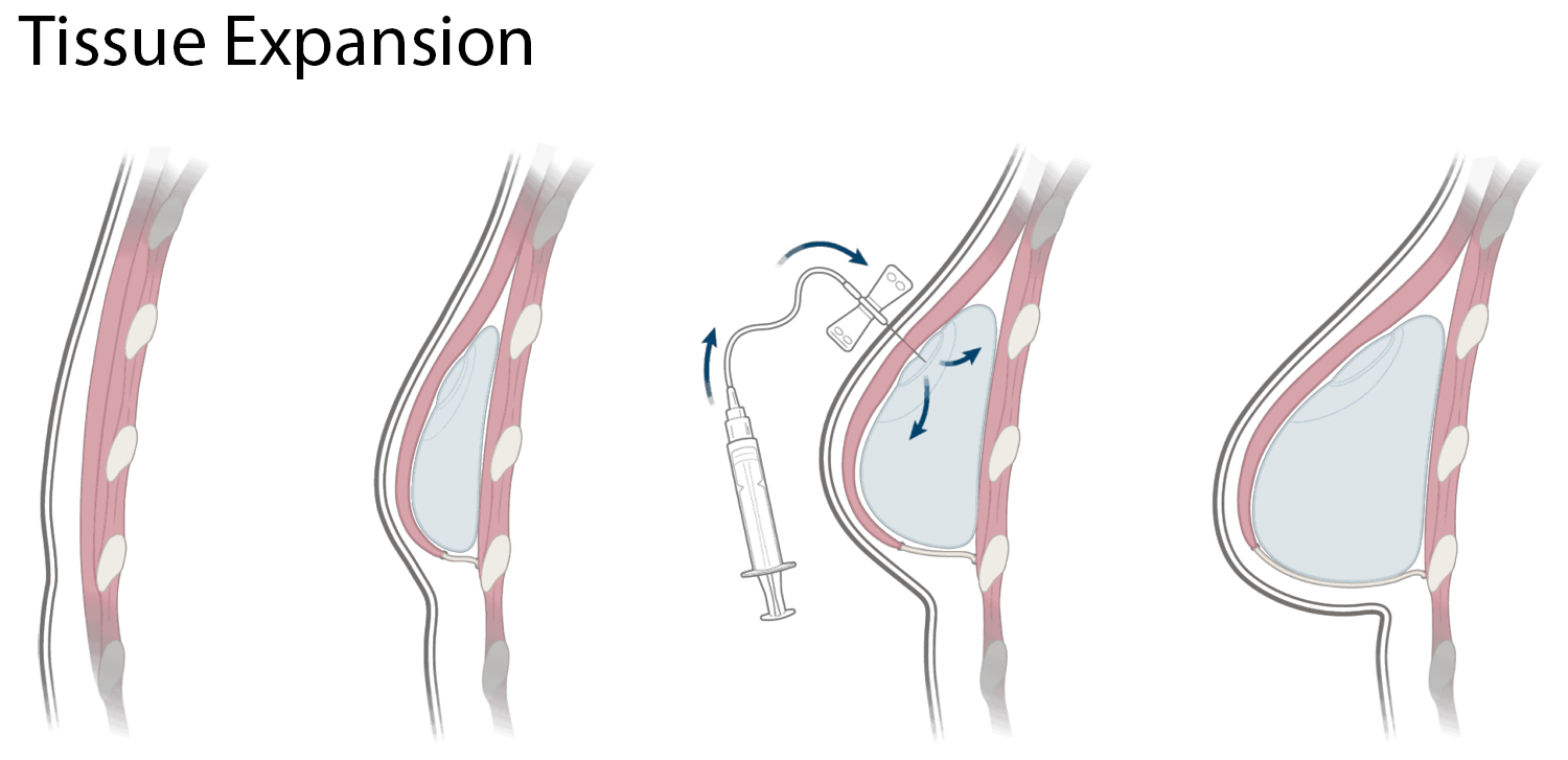 Prosthetic reconstruction with a temporary tissue expander or a saline-filled implant placed behind the pectoral muscle