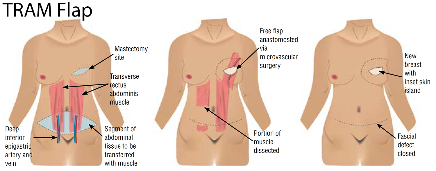 Another option is a Transverse Rectus Abdominis Myocutaneous - TRAM flap - an ellipse of abdominal skin and subcutaneous tissue based on the rectus abdominus muscle. Blood supply is maintained with superior epigastric and inferior epigastric arteries