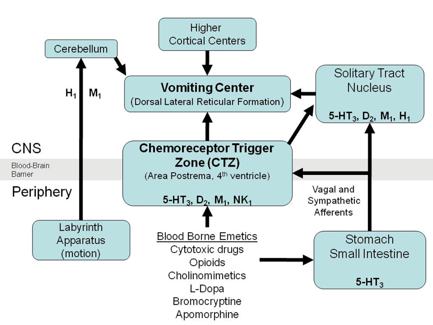 Chemoreceptor trigger zone: 5HT3, D2, M1, NK1