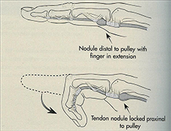 (see pictures below). The tendons work like long ropes connecting the forearm muscles with the fingers and thumb bones. In the finger, the pulleys form a tunnel under which the tendons must glide. These pulleys hold the tendons close to the bone. The tendons and the tunnel have a slick lining that allows easy gliding inside the pulleys (see below left: Normal finger). Trigger finger/thumb happens when the tendon develops a nodule (knot) or swelling of its lining. When the tendon swells, it must squeeze through the tunnel's opening (flexor sheath), which causes pain, popping, or a catching feeling in the finger or thumb (see below right: Abnormal finger). When the tendon catches, it produces inflammation and more swelling. This causes a vicious cycle of triggering, inflammation, and swelling. Sometimes, the finger becomes stuck (locked) and is hard to straighten or bend.