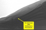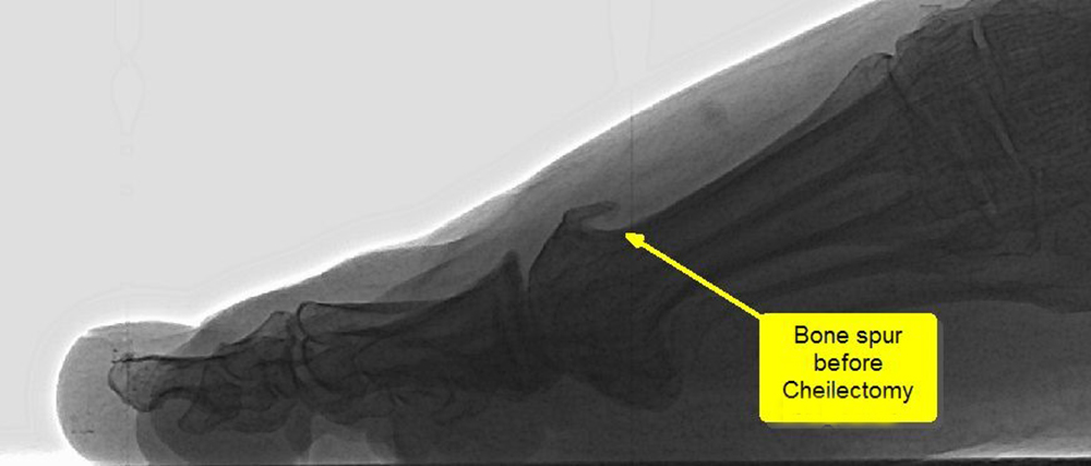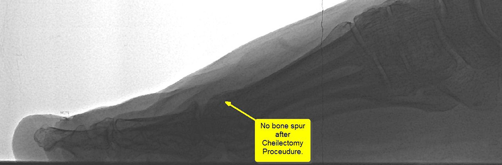 The foot is bandaged, and patients are encouraged to stretch the big toe the day after surgery gently. As the toe heals, patients should slowly increase the movement of the toe. Patients return for a checkup 1-2 weeks after surgery and begin gentle exercises. Patients will typically be seen again 6-8 weeks after surgery. After a cheilectomy has been performed, bone spurs will rarely grow back. If the patient received the cheilectomy because of arthritis, there will most likely be an improvement in the arthritic pain within one month, and movement in the joint will increase.