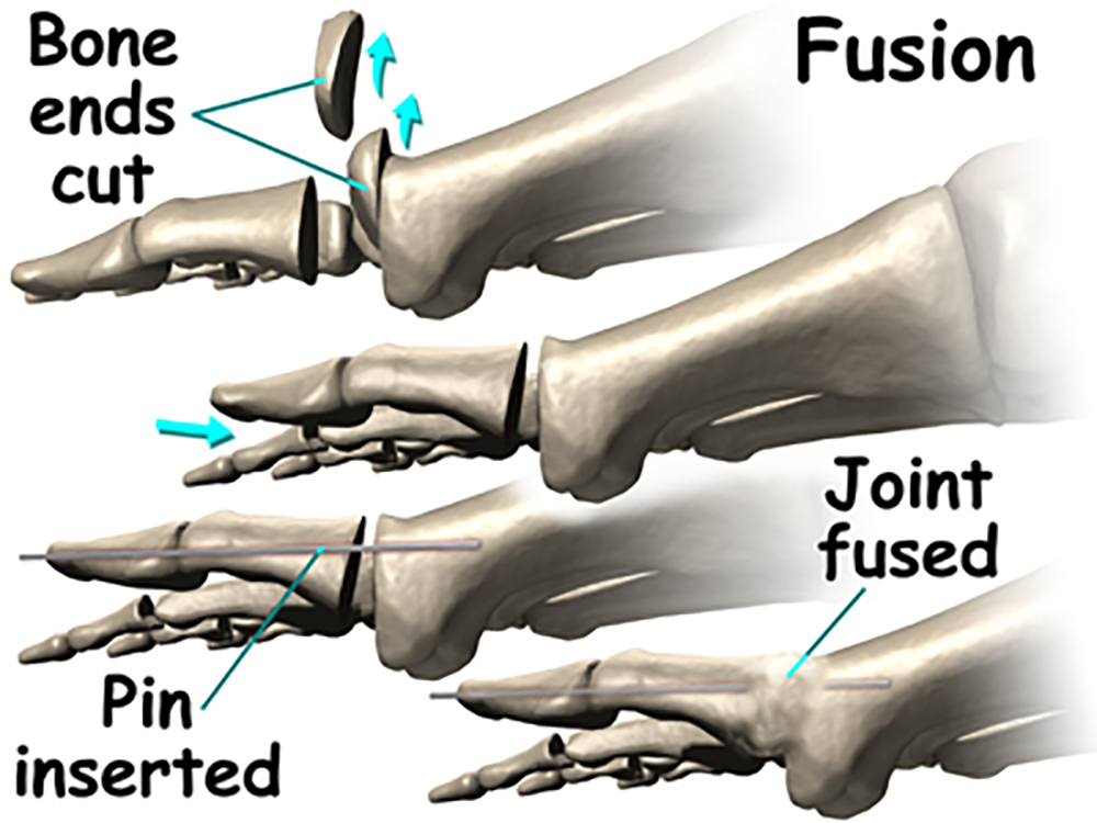 The main advantage of a fusion is that it is a permanent correction that eliminates arthritis and pain. The disadvantage is that it restricts the movement of the big toe. After the big-toe fusion, patients can typically exercise, run, and comfortably wear most shoes afterver, wearing a heel higher than an inch and a half is difficult after