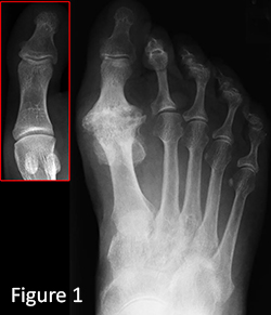 As seen on the X-ray in Figure 1, arthritis of the big toe joint is present, with significant bone spurs around the joint.