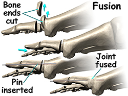 As the arthritis increases, the ability of an osteotomy or cheilectomy to correct the problem, maintain motion, and prevent the arthritis from worsening is minimal. For these patients, either a fusion of the big toe (an arthrodesis) or removal of bone from the joint (an arthroplasty) is performed. The big difference between a fusion and arthroplasty is the movement of the big toe.